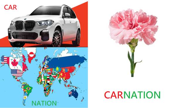 carn-,意指「肉」或「肉色」。原始康乃馨的顏色常為肉粉色。carnation 的音譯,其發音「car-nation」與中文「康乃馨」的字音結構相似。carnation 與母親節以及其溫暖的色彩連結,能幫助記憶。 carnation → car (車子) + nation (國家)