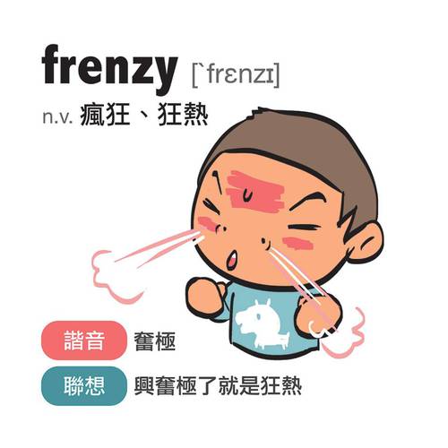 frenzy n.狂亂 ( 極度激動的狀態 ) =delirium=mania【類】convulsion:contraction=frenzy:emotion痙攣是收縮加劇=瘋狂是感情加劇frenzy:calm[calmness]=abandon:prohibit[inhibition]狂暴:使平靜=放任:禁止 ( 反義 )