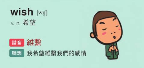 : 「餵食」(wèi shí)。想像你「許願」去「餵食」可愛的小動物,將 'wish' 的發音與「餵食」連結。